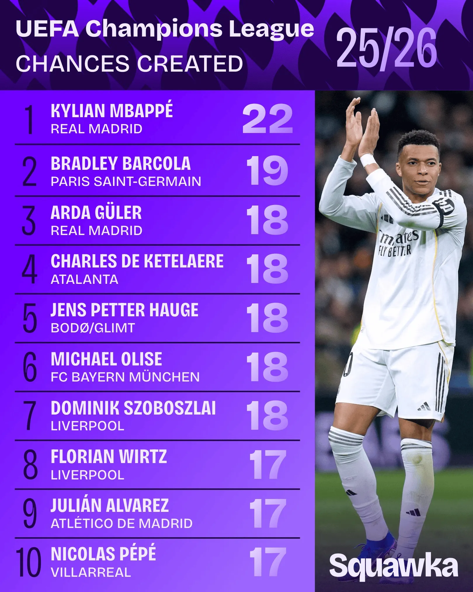 虎扑01月23日讯 根据Squawka的统计,姆巴佩是本赛季欧冠联赛目前唯一一位创造了20次以上机会的球员: